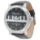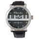Elegante reloj de piano blanco y negro para los hombres. Personaliza con nombre, monograma, frase graciosa o lema. Color de fondo personalizado. Ideas de regalo de cumpleaños para piano-bar, pianista, profesor de música clásica, músico, instructor, productor, artista, esposo, papá, etc. Reloj masculino elegante con correa de cuero.