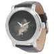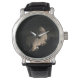 Este reloj masculino presenta una luna de puesta en la cara con correa de muñeca de cuero negro y espalda plateada.