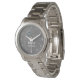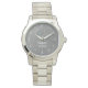 Elegante reloj con símbolo infinito sobre fondo metálico.