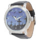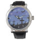 Un minúsculo paisaje acuático de murciélagos en vuelo sobre un cementerio por la noche adorna este espeluznante reloj de Halloween.