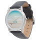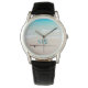 Reloj monogramado para hombres. El agua tropical turquesa y la arena de la playa son la imagen de fondo de un poste de pesca y plantilla para tres iniciales. La cara del reloj funciona para cualquier banda de estilo. La letra es de color gris oscuro y rojo marrón oscuro. Un regalo perfecto para el pescador de agua salada.