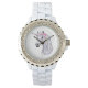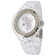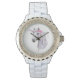 Un reloj caprichoso de temática unicornio con una banda blanca y detalles brillantes. Los elementos más destacados son el diseño intrincado y los colores vivos, mientras que la iluminación suave y difusa realza su encanto.