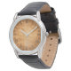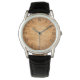 Diseño de reloj con números romanos con textura de fondo de madera cálida.