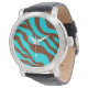 Este reloj de diseño está decorado con una estampada de cebra turquesa y marrón oscuro. El diseño es de arte original.