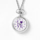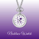 Regalo de Reloj de collar. Con la palabra 'amor' y una forma cardíaca que sustituye a la letra O. Púrpura y blanca