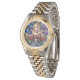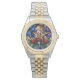 Las cosas favoritas son la plata y el oro. Un reloj de mujeres con una mujer encapuchada ilustrada y iris dentro.
