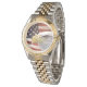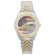 Este reloj clásico de muñeca masculina se muestra en color oro y plata de dos tonos. Tiene una impresionante imagen de nuestros símbolos estadounidenses de libertad como la cara de este reloj. Barre de segunda mano. Personalizar este reloj o compra como está.