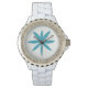 Este reloj de esmalte blanco está diseñado con la representación de una estrella de color turquesa y rodeado de diamantes de imitación.