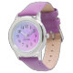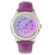 Cute chica mira con un fondo irrisorio, púrpura y rosa perlino y personalizado con su nombre. Elige tu correa de reloj. Este es un violeta que coordina. Este reloj ayuda a que su hijo aprenda a contar el tiempo con las manos marcadas con "hora" y "minuto".