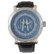Elegante y elegante, limpio y simple relojes monogramados personalizados para el hombre especial en su lista de regalos. Marcas de hash grises y blancas de estilo clásico pero moderno en la cara azul agate. Negrita de las iniciales de los monogramas en el estilo art deco Gatsby para los caballeros sofisticados — haga clic en Personalizar para cambiar los tamaños de letra, estilo o colores. Los relojes de monograma de novedad hacen un regalo personalizado perfecto para cumpleaños, aniversario, graduación, jubilación, asistentes de boda, vacaciones y otras celebraciones de hitos.