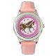 Aquí hay un reloj de pulsera de bonito con un caballo de orejas y un borde rosado. ¡Un regalo perfecto para el chica amante del caballo! ¡Increíble! Lo estamos mostrando en un reloj de niños con una linda banda de relojes rosa, pero también está disponible en otros estilos de reloj y colores de banda de relojería en nuestra tienda. Concepto de diseño copyright Scarebaby Design.