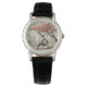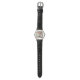 Un reloj de pulsera delicado y elegante que presenta un diseño cautivador de una joven mujer leyendo un libro sobre un columpio en un entorno de ajetreo urbano. El funda dorado rosa del reloj y la correa de cuero negro exudan sofisticación, mientras que los detalles intrincados del ilustracion le dan un toque de fantasía.