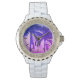 Reloj femenino exótico con imagen de la palmera. Sube tu propia imagen opcionalmente. Banda de relojes de pulsera blanca y giratoria con cristales. Cara moderna sin dial de números con letras monográficas personalizados. Elegante idea de regalo de cumpleaños para mujeres y chicas. Crea una para novia, hija, hermana, mamá, prima, novia boda, dama de honor, etc. Impresión tropical con filtro de neón rosa y morado.