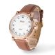 Reloj masculino dignificado con banda de cuero marrón. Elegante reloj numérico romano con banda de cuero marrón. Crea tu propio reloj único de fantasía para él. Clásica pieza de tiempo con números romanos, nombre, fecha y color de fondo personalizado. Hermosa idea de obsequio para hombres que se casan, se retiran u otras ocasiones. Haz tu propio horario de moda para amigos honrados, familia, compañero de trabajo, novio, invitados, mejor hombre, etc. También es grandioso como regalo de cumpleaños o Navidades de lujo para el abuelo, papá, marinero, capitán de barco, compañero de trabajo, colega, jefe de empresa, novio, empleado, entrenador, tío, socio de negocios, profesor, etc. Ideas de regalo de lujo para él. Plantilla de tipografía de guión elegante. Agregue su propio nombre personalizado y fecha impresa en el dial.