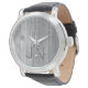 Un reloj con un fondo de madera curtida rústico y gris plateado personalizado con tus iniciales hace un gran regalo para cualquier hombre. Cuando personaliza las iniciales, deja un espacio entre las iniciales para obtener el efecto que ve en el ejemplo.