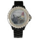 Un reloj de hombres con la fotografía de un gnomo de jardín y su perro negro. © ArianeC Photography