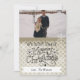 Texto negro que dice "Te deseamos una Feliz Navidad" delante y "¡y un Feliz Año Nuevo!" detrás con puntos de arcilla sobre fondo blanco, copos de nieve blancos y ciervo de silueta, y áreas donde puedes agregar tu nombre familiar y foto en una tarjeta de felicitación de Navidades ¡seguro que quieres mandar a familia y amigos!