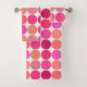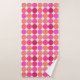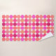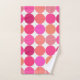 Toalla colocada en una huella geométrica moderna de mediados del siglo XX de puntos gigantes, en una cuadrícula de nueve colores coordinados: tonos fucsia, rosa coral, naranja coral, malva y puff, sobre fondo blanco