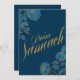 Hermosa tarjeta azul floral y dorada Purim Sameach para mishloach manot.