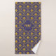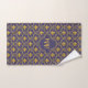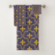 A set of towels with a seamless repeating purple and gold quatrefoil pattern with fleur de lys symbol (lilies). With a customizable text field for your initials.