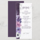 An elegant purple floral wedding menu card featuring soft watercolor flowers in lavender, blush, and white, paired with delicate botanical line art for a romantic and sophisticated look. The tall vertical layout with a slim floral border and clean white background creates a refined presentation for starters, main course, and dessert. A beautiful choice for couples creating a coordinated floral wedding stationery suite with a soft purple color palette.