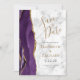 Esta elegante y moderna boda, salvo la tarjeta de fecha, tiene un borde de agate color morado con falso purpurina de oro. El texto del personalizable combina el guión dorado con el tipo de letra de copperplate negro y dorado sobre un fondo de mármol gris y blanco. El reverso presenta un diseño de agate morado y dorado a juego.