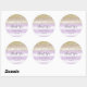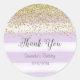 Pegatina redondo para el favor de cumpleaños con purpurina de oro falso y fondo de rayas moradas.