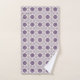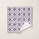 "Image showing a bathroom towel and washcloth set, both featuring a geometric pattern with purple, white, and gray colors, hung and folded neatly."