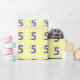 ¡Es hora de celebrar los 5 años! El número cinco está pintado de morado y tiene señales de rizo que lo rodean. Se repite en un patrón y se imprime sobre un fondo amarillo, sobre papel de envoltura. El color de fondo se puede personalizar.