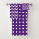 toalla de baño de bonito polka dot colocada en blanco y violeta real.