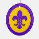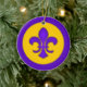 Un ornamento de cerámica del navidad de la flor de lis. En ambos lados, un fondo del oro, con una flor de lis de color morado oscuro y púrpura. Si usted tiene gusto, usted puede añadir el texto usando el botón del PERSONALIZAR debajo de la imagen. Personalícela con el nombre, la fecha, el nombre del equipo, o el otro texto. Hace un gran regalo de vacaciones, o parece hermoso en sus paquetes del árbol de navidad o del navidad.