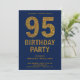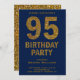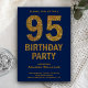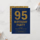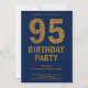 Sorprende a tus invitados con esta glamorosa invitación a la fiesta de cumpleaños número 95 que incluye un atrevido texto de purpurina dorado sobre un fondo azul. Simplemente agregue los detalles de su evento en esta plantilla fácil de usar para convertirla en una invitación única. Voltea la tarjeta para revelar una textura falsa de purpurina de oro en la parte posterior de la tarjeta.