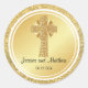 Un hermoso pegatina boda cristiano de oro presenta una cruz ornamentada sobre un brillante fondo metálico de oro. El borde exterior del pegatina es un patrón purpurina de oro. Dos anillos blancos enmarcan el fondo dorado liso interior que contiene los nombres de la cruz, la novia y el novio y la fecha del boda. Hermosa manera de incluir tu fé en tu decoración boda. Sellos inspiradores para sus bolsos de favoritas de boda, cajas de pasteles bodas y notas de agradecimiento. Fácil de personalizar.