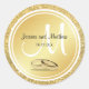 El Purpurina de oro crea una hermosa ventaja para este boda gracias pegatina. El oro metálico y el blanco forman los círculos interiores. Una gran y elegante carta blanca forma el apellido inicial de la pareja. Sus nombres y fecha de boda están escritos en un guión negro elegante y ornamentado. Debajo del monograma aparecen dos hermosos anillos de boda dorado y nombres de novias y novios. El resultado es un impresionante pegatina romántico boda que se verá hermoso en los bolsos de favoritas de la boda, cajas de pasteles bodas y papelería de bodas como notas de agradecimiento.