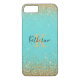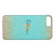 Glam iPhone 7/8 funda hecho en turquesa con falso purpurina de oro a lo largo de la parte superior e inferior. Un monograma de color dorado tan de una letra y un nombre negro están listos para personalizar según tus necesidades.