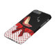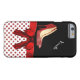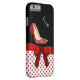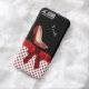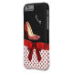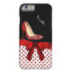 Moda iPhone 6 funda hecho en negro, en la parte superior y un blanco con purpurina rojo con aspecto de polka punto impresión, en la parte inferior. Gráficos de una cinta de satén roja y un arco decora el medio y un par de tacones de estilete rojo purpurina están en la mitad superior. Personalice el texto blanco para usted o como una gran idea de regalo.