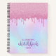 Este cuaderno de dibujo personalizado de 8,5 x 11 tiene goteo de purpurina rosado y texto morado sobre un fondo de Relieve metalizado holográfico. Personalizar el cuaderno de bocetos con el nombre de tu elección para hacer que alguien se sienta especial. Hace un regalo divertido para cumpleaños o Navidades. Viene en una variedad de colores. Diseñado para ti por Blackberry Boulevard.