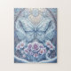 このジグソーパズルは、透き通るような水色と白で統一された、冬の幻想的な世界を描いています。中央には、まるで氷の結晶から生まれたかのような、美しく輝く蝶が鎮座しています。背景は雪の結晶をモチーフにしたステンドグラス風のデザインで、冷たくも神聖な雰囲気を醸し出しています。下部には、霜をまとった雪色の薔薇と小花が咲き誇り、全体に繊細でロマンチックな美しさを与えています。組み立てることで、静寂に包まれた冬の魔法のようなアート作品が完成します。