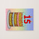 Este animado y divertido diseño de rompecabezas de cumpleaños presenta una representación al estilo personalizado de una torta de cumpleaños de tres niveles con velas en forma de numeral en la parte superior que muestran el número "15", junto con el mensaje "FELIZ CUMPLEAÑOS 15", y un nombre de destinatario de personalizable. El fondo tiene un patrón multicolor de gradiente inspirado en el espectro arcoiris pastel. Un enigma de cumpleaños alegre y personalizable como este podría ser usado para reconocer el décimo quinto cumpleaños de alguien. [~Z0000621]