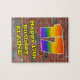 Este fascinante y vibrante arte urbano callejero y el diseño del rompecabezas de cumpleaños inspirado en el graffiti presenta un gran número "17" con un colorido patrón inspirado en el gradiente del espectro del arcoiris. También incluye el mensaje "Feliz cumpleaños número 17", y un nombre personalizado. El fondo tiene un patrón de pared de ladrillo. Un rompecabezas vibrante y de personalizable como este podría ser usado para reconocer el decimoséptimo cumpleaños de alguien. [~Z0000545]