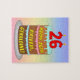 Este divertido y alegre diseño de rompecabezas con temática de cumpleaños incluye una representación al estilo personalizado de una torta de cumpleaños de tres niveles con velas en forma de número en la parte superior que muestran la edad de "26", junto con el mensaje "FELIZ CUMPLEAÑOS 26", y un nombre de destinatario de personalizable. El fondo tiene un patrón multicolor de gradiente inspirado en el espectro arcoiris pastel. Un acertado rompecabezas de cumpleaños personalizado como este podría ser dado para celebrar el 26º cumpleaños de alguien. [~Z0000621]