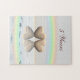 Rompecabezas con mi imagen de dos corazones de madera flotando en el agua bajo un arcoiris. El texto del personalizable dice "5 años".