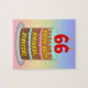 este animado y colorido diseño de rompecabezas con temática de cumpleaños incluye una representación al estilo personalizado de una torta de cumpleaños de tres niveles con velas en forma de numeral en la parte superior que muestran el número "66", junto con el mensaje "FELIZ 66º CUMPLEAÑOS", y un nombre editable para el destinatario. El fondo tiene un patrón multicolor de gradiente inspirado en el espectro arcoiris pastel. Un rompecabezas divertido y personalizado de cumpleaños como este puede ser una manera divertida de enviar deseos de cumpleaños a alguien que está celebrando su sexagésimo sexto cumpleaños. [~Z0000621]
