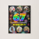 Este animado y divertido diseño de rompecabezas con temática de cumpleaños presenta el número "67", con un vibrante patrón de gradiente inspirado en el espectro del arcoiris, junto con el mensaje "FELIZ 67 cumpleaños," y un nombre de personalizable, en un patrón inspirado en estallidos de fuegos artificiales de celebración multicolor. Las imágenes cercanas a la parte superior e inferior se pueden personalizar. tal vez con fotos del destinatario y/o de la familia y amigos del destinatario. Un divertido rompecabezas de cumpleaños de personalizable como este podría ser una manera divertida de dar saludos de cumpleaños a alguien que está celebrando su sexagésimo séptimo cumpleaños. (Fotografía © Storytree Studios, Stanford, CA.) [~Z0000664]