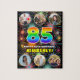 Este alegre y emocionante diseño de rompecabezas de cumpleaños presenta un gran número "85" con un colorido patrón de gradiente inspirado en el espectro del arco iris, junto con el mensaje "FELIZ CUMPLEAÑOS 85", y un nombre editable, en un patrón inspirado en fuegos artificiales de celebración multicolor. Cerca de arriba y abajo hay imágenes que se pueden personalizar, tal vez con fotos del destinatario, y/o la familia y amigos del destinatario. Un enigma de rompecabezas alegre y de personalizable como este podría ser una manera divertida de entregar algunos deseos de cumpleaños a alguien que está celebrando su cumpleaños ochenta y cinco. (Fotografía © Storytree Studios, Stanford, CA.) [~Z0000664]