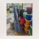 A challenging though relaxing puzzle with many colors with lots of depth showing Stacks of Colorful buckets with the longest sparklers leaning beside them on a sunny tienda in Guatemala