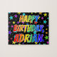 Este diseño de rompecabezas vibrante, divertido, con temática de cumpleaños, tiene el mensaje "FELIZ CUMPLEAÑOS, ADRIAN" con los personajes con un coloreado patrón de gradiente inspirado en el espectro del arcoiris, junto con un campo animado de patrones de fondo de estrellas. Un rompecabezas colorido como este podría ser una manera divertida de enviar un mensaje de bienvenida de cumpleaños a alguien llamado Adrian. [~Z0000468]
