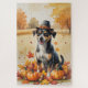 Una pintura acuarela de un perro alegre sentado en medio de un montón de hojas caídas vibrantes, rodeado de pequeñas calabazas y bellotas dispersas. El perro lleva un pequeño gorra peregrino y vigas de alegría, capturando el espíritu del Día de Acción de Gracias. Como telón de fondo, los campos de suave cosecha y los árboles de tonos dorados crean un ambiente campestre tranquilo. Las texturas suaves y los tonos cálidos y mudos del otoño le dan al lugar un ambiente acogedor y nostálgico, perfecto para celebrar la belleza de la temporada.