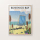Cartel de viaje de Runswick Bay Yorkshire, con una tumbona a rayas en la playa.