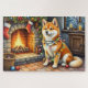 Puzzle Akita Sitting by Fireplace with Christmas Lights